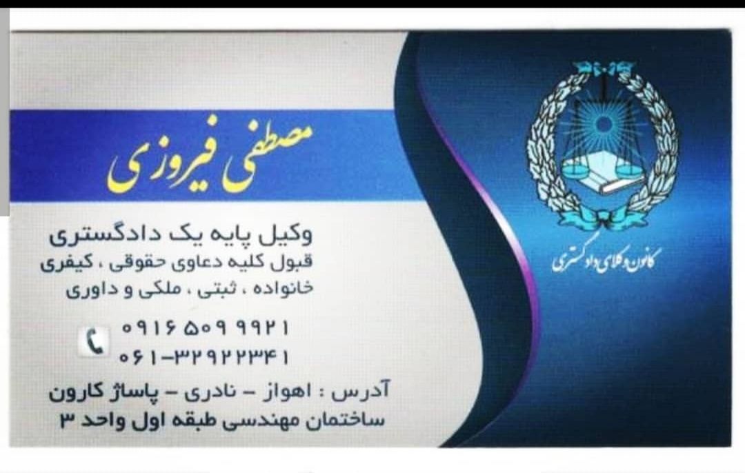 آدرس اهواز-گلستان-خيابان فروردين بین خیابان آذرودی مجتمع رتاج طبقه۴واحد۱۲ پنجاه متری بانک ملی-جنب بانک شهر و مسکن دفتر وکالت مصطفی فیروزی