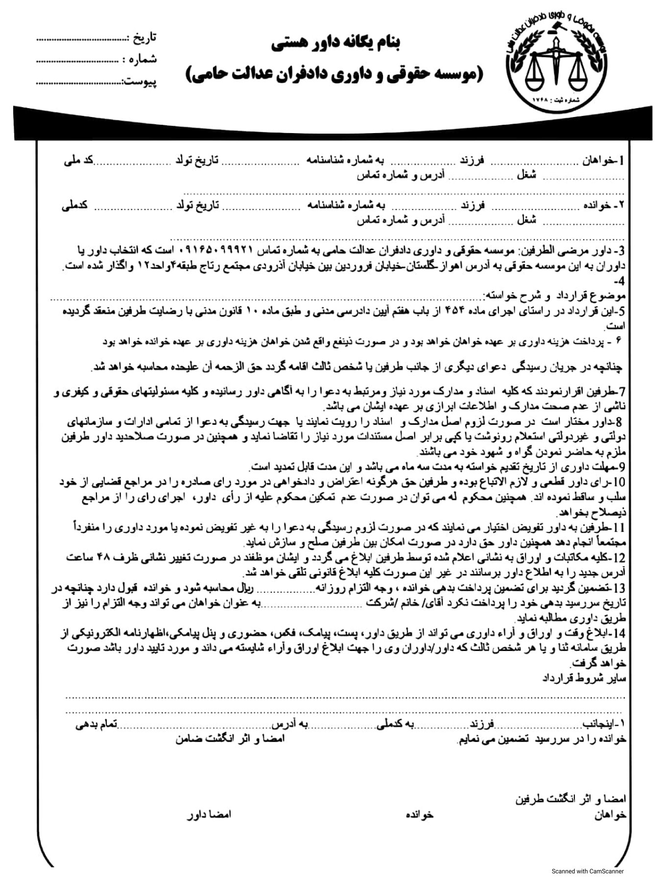 جهت دریافت مشاوره تلفنی رایگان داوری. و ارسال فرم داوری موسسه حقوقی و داوری دادفران عدالت حامی تحت مدیریت.وکیل پایه یک دادگستری مصطفی فیروزی با شماره تماس ۰۹۱۶۵۰۹۹۹۲۱ ارتباط برقرار کنید.